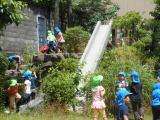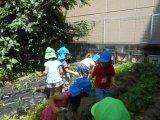 昨日までの梅雨空が嘘のように、今日は真夏のような暑い一日になりました。まさに昨日の“てるてる坊主”の効果ですね。そして今日5歳児は、ほしファーム(元明倫幼稚園)の畑のタマネギ、ジャガイモのお世話に出かけました。年長組に進級してから2度目の経験なので、水やりも雑草抜きも自分たちで次々とすすめる姿にたのもしさを感じました。畑の土から少しだけ顔をのぞかせているタマネギを見て「これって、もう食べられるんと違う?」「まだや。もうちよっと大きくなってからや」との子ども同士の会話も聞かれ、皆で収穫を心待ちにしている様子がうかがえます。