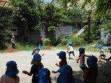ひと仕事終えたあとは、元明倫幼稚園の豊かな自然の中で虫探しや花摘みをしたり、全員で“ミニうんどうかいごっこ”をしたり、いっぱい汗を流して楽しんで帰ってきました。