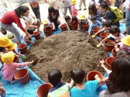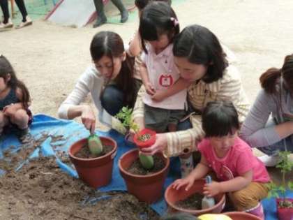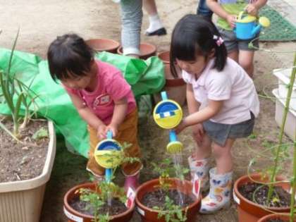 先日,3歳児の親子でミニトマトの苗を植えました。自分の植木鉢に土を入れて,「どれにしようかなぁ〜?」と,たくさんあるミニトマトの苗から一つの苗を選んで植えました。「おいしいミニトマトになってね!」と声をかけながら植える姿も見られました。これから毎朝,登園時に親子で様子を見たり,水やりをしたりしていこうと思います。愛情をたっぷり込めて,おいしいミニトマトがたくさんできるといいですね!