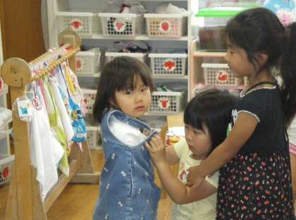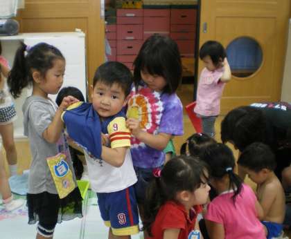 3歳の子どもたちも最近は暑いので,着ている服も随分身軽となり,自分でも脱ぎ着が大分できるようにもなってきています。でも今日は,お兄さん・お姉さんが手伝ってくれるので,服や靴下など全て脱がしてもらっている人もいました。脱がす5歳児も脱がされる3歳児も一生懸命なのが,横でみていてとてもほほえましく思いました。
