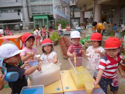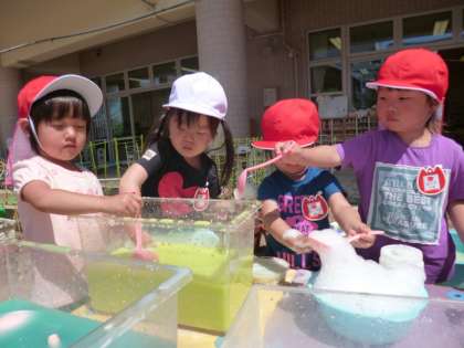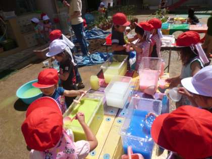 3歳のテラス前では,色水遊びと泡遊びが合体して,いろいろなジュース作りを楽しんでいます。水がいろいろな色に変わっていく様子を「きれ〜」「わぁ〜」と言いながら喜んで見ています。先生達も,子どもと一緒に驚いたり,発見したりすることで,その思い共有し,より遊びが楽しくなるようなかかわりをすることを大切にしています。