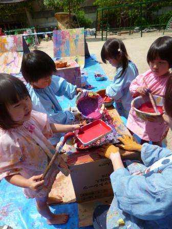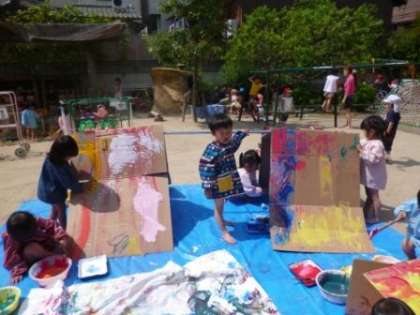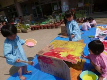 今日は,年少のちゅうりっぷ組が園庭で絵具遊びをしました!大きなブルーシートを園庭に敷くと「うわぁ,海や!」「すご〜い!」と大喜びの子どもたち。好きな色を器に入れてもうと,手や足に色を付けて魚になって泳いだり,ローラーやハケで段ボール箱にヌリヌリ・・・としたり。卵パックに絵の具を流しいれて,「たこ焼きつくろう〜!」と言ったり・・・。好きな絵具の色を混ぜて,できた色を食べ物に見立てたり,手足でトロトロの絵具の感触を楽しんだりする姿が見られました。いっぱい遊んだ後,絵具の付いた足をタライで洗うと,色水ができました。どんどん色が変わっていくその様子もとても楽しい子どもたちでした。