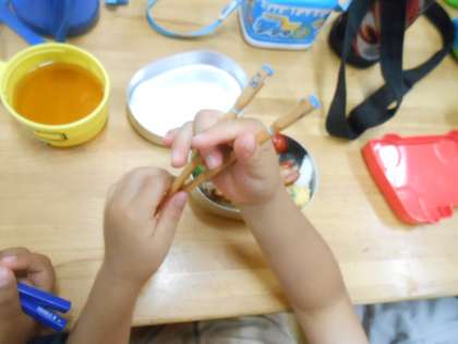 4歳児は,持ち方支援用のお箸から普通のお箸に移行していっているときです。今日は,お箸に初めて挑戦した話を書きたいとおもいます。