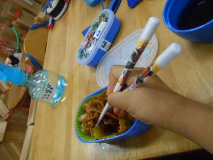 弁当の時間,いつもの持ち方支援用のお箸ではなく普通のお箸が入っていたAくん。最初はお箸を見てびっくりした様子でした。でもそれは保護者の方と私で相談していたことでした。