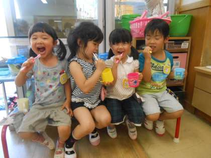 先日,歯磨き指導をしてもらった後で,食後は歯磨きをしています。歯ブラシを口に入れて椅子に座って磨きます。最後は先生に仕上げ磨きをしてもらう子もいて,とってもかわいいですよ!歯磨きしてすっきりして,昼からの遊びに向かっています。