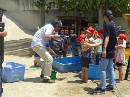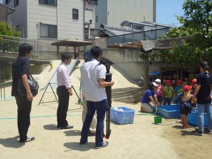 昼ごろに関西テレビから取材を受けました。子どもたちが熱中症対策をして水遊びを楽しんでいるところを取材したい,とのことでした。