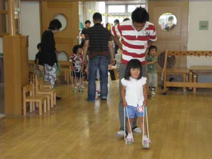 3歳児は竹ぽっくり,4歳児は一本歯げた,5歳児は竹馬です。まず,どの学年も足を乗せるところが少しでもまあるくなるように,サンドペーパーで磨くことから始まりました。子どもたちも自分で磨いて頑張りました。