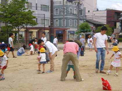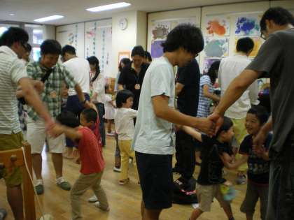 4歳は,親子でペアになって「なべなべ」でも遊びました。ちっちゃな子どもとおっきな大人の「なべなべ」なので,大人の方にはかなり低くなっていただかなくてはいけなかったのですが,うまくかえることができてよかったですね。また友達同士でもどんどんかえれるようになると楽しいですね。