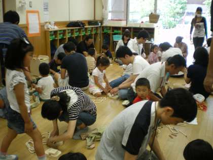 サンドペーパーをかけたりして調節してくださいました。出来上がった一本歯げたは,お家の人と一緒に竹間公園に行き,挑戦しました。紐を少し引っ張り加減にするほうが子どもたちにとっては動きやすいです。歩きながら,また紐を調節して頑張りました。