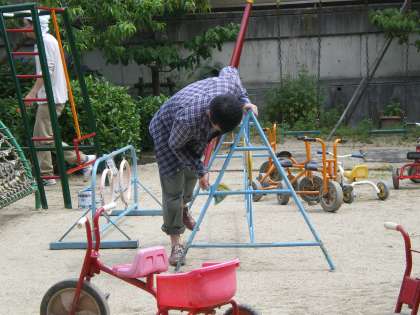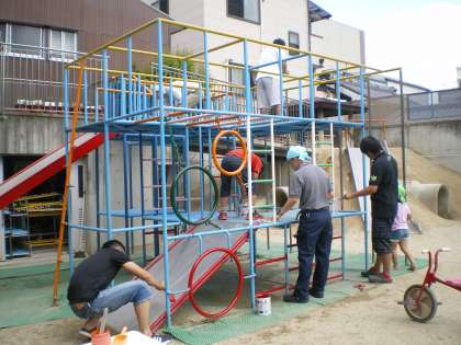 とても暑い時間帯でしたが,現役パドリの方6名とパドリOBの方が1名合計7名の方で,三輪車やうんてい,ジャングルジム,平均台などをきれいに塗ってくださいました。
