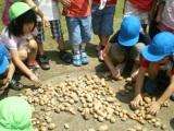 今朝早くまで弱い雨が降っていたこともあって、畑の土はちょうど子どもたちが素手で掘り起こしやすい固さです。少しだけ土から顔を出しているタマネギめがけて一斉に手を伸ばし掘り始める子どもたちや、大人なら見逃してしまいそうな小さなジャガイモを「赤ちゃんジャガイモ〜」と喜んで集める子どもたち。みんなで頑張って収穫したその数は、大小合わせて、ジャガイモ612個、タマネギ72個。本当にたくさん採れて皆大喜びです。子どもたちの気持ちは早くもカレーパーティーに向けてますます盛り上がったようです。