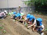 ジャガイモ・タマネギを収穫した後の畑は、すぐに先生たちによって新しいうねに生まれ変わり、子どもたちによって新たにサツマイモの苗が植えられました。秋にはおいしいサツマイモができますように…。