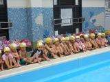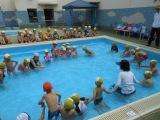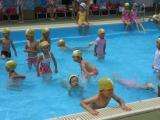 5歳児にとって、今日が今年初めてのプール遊びの日になりました。水着への着替えなどの準備も次々と自分たちで済ませ、みんな喜んで屋上プールへ上がりました。最初はシャワーの水にも「キャ〜ッ!冷たい〜」と叫んでいた子どもたちでしたが、いったんプールに浸かると「気持ちい〜い」「楽しい」との歓声と、みんなの笑顔でいっぱいになりました。顔に水がかかっても平気で大胆に遊ぶ姿や、友達との水のかけあいの勢い強さに、5歳児らしいたくましさも感じさせられました。