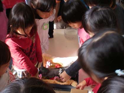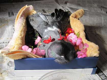 朝、鳩舎を見ると孔雀鳩のはーとぴっぴちゃんが死んでいました。統合前の幼稚園にいて引き続き飼育していました。少なくとも14歳以上です。「あんまり餌食べはらへんかった」「目つぶって寝たはった」最近の様子が思い出されます。箱に入れて園庭の花を入れて・・・。「また起きるかもしれんから、そんなとこ(箱)入れたらあかん」と言い出す年中児。「明日来る一日動物園のお医者さんに診てもらおう」と言う子どもも。「もうお祖父さんやったんやから」鳩の寿命は10数年とのこと。悲しいお知らせが口コミで伝わっていきました。生き物と暮らす生活の中で心でいろいろなことを学ばせてもらいます。長い間幼稚園にいてくれてありがとうの気持ちで見送りました。