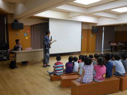 今日は5歳児が遊戯室に集まり、地域の祇園祭に詳しい方お二人をお迎えして、祇園祭についてのお話を聞きました。お二人が浴衣を着てこられたことで、遊戯室が祇園祭ムードに包まれ、子どもたちも興味深くお話を聞くことができました。