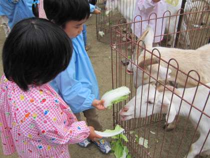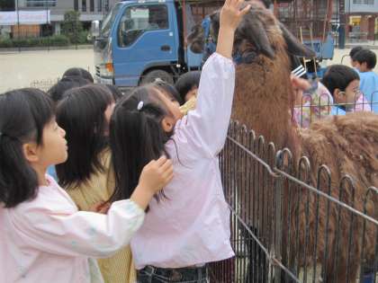 幼稚園に動物達がやって来ました。大きいラマに背伸びして餌をあげたり、大型ネズミ種のマーラーには指と餌の見分けができない位見え方が弱いからと教えてもらったりお腹をすかせたヤギたちの迫力に押されながら餌をあげたりしてふれあいました。3歳児4歳児5歳児のグループになって子ども達も移動していろいろな動物のところに行きました。動物達が仲間が来たと思ってくれていたかも知れませんね。