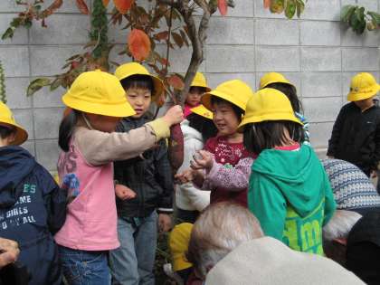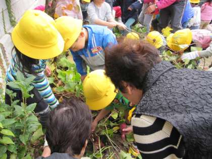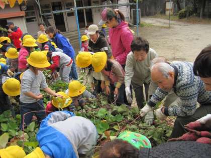 園庭に出て一緒に芋掘りをしました。どんなのが出来ているか、わくわくです。「大きいのが掘れたね、折れんとよかったね」「昔は芋ばっかり食べてたのよ」「つるのとこも食べられるよ」いろいろ子ども達に話しかけてくださいます。「こんなの何年ぶりかしら」「楽しかったです」「ありがとうございました」と私にも声をかけてくださいました。こちらの方こそです。良い機会を与えていただきありがとうございました。