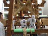 函谷鉾では,まさに車輪がはめられるところを見ることができました。その後に,まだ車輪がついていない鉾を見た子どもが,「ここ(の柱)に車輪がつくんやなぁ」と発見していました。