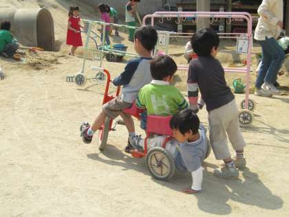 4歳児の男の子たちが二人乗り三輪車で遊んでいます。赤い大きい三輪車は幼稚園に2台しかありません。人気があっていつも誰かが乗っています。今日は4人で遊んでいます。3人乗って一人は押しています。思わず「その乗り方は危ないでしょ」と声をかけそうになって、でも、躊躇してしまいました。スピードを出さずに大勢で乗ることにみんなで挑戦していたようだったからです。「いくで」「ええか?」「大丈夫か?」と声を掛け合っています。ほんの数メートル進んだだけでしたが、子どもたちは大満足の様子で笑い合っていました。幼稚園には、遊具や乗り物は家庭での個人用のように十分な数はありません。みんなの物ですから、一緒に譲り合って代わり合って使用することになります。この子どもたちは三輪車を通して友達とのかかわりも学んでいるように思いました。