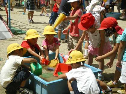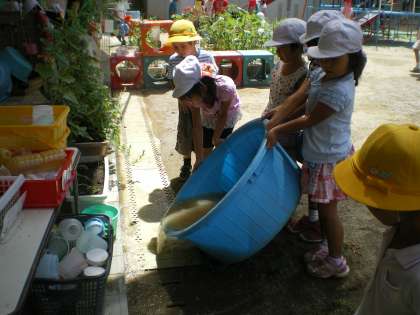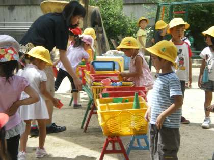 園庭では4歳児と5歳児が一緒に砂場のおもちゃをきれいに洗って分類をして片付けたり,三輪車やスケーターなどもきれいに洗ったりしました。