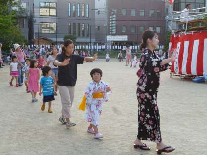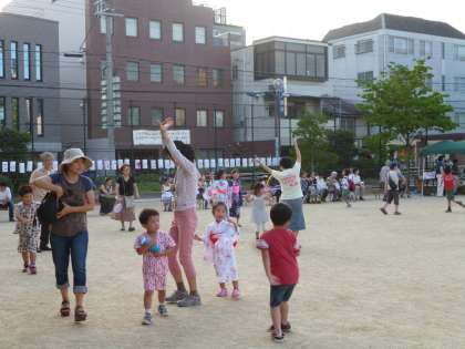 だんだん暗くなり,今も大人の方たちの盆踊りがつづいていますが,いろいろな遊びのコーナーもあり,子どもたちにとっては夏休みの楽しいひと時となったことでしょう。
