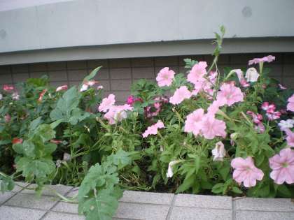 園舎北側の花壇には,ペチュニア・インパチェンスなど赤・ピンク・紫系の花々です。