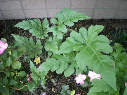 葉っぱをよ〜くみてみると何とそれはスイカの葉っぱでした。種まきをしたわけではないのですが,このペチュニアやインパチェンスは,京都教育大学の農場で育てられた苗を購入して移植したものです。きっとこぼれダネが,花の苗の中に入って一緒にもえぎ幼稚園にやってきたのではないかと思いました。