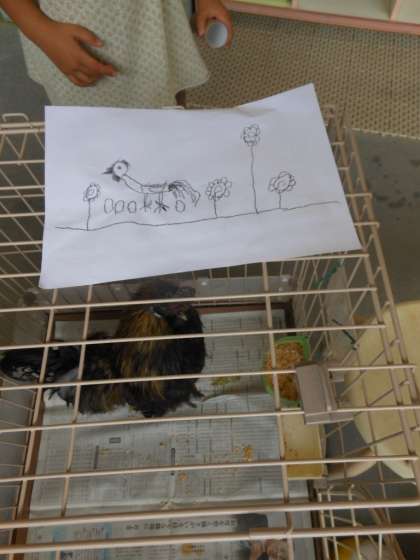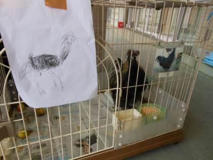 テラスでは,飼育しているウコッケイに「元気やった?」と話しかけていました。ウコッケイの絵を友達2人で並んでかいて,ウコッケイに見えるように,と飼育ゲージに飾っていました。