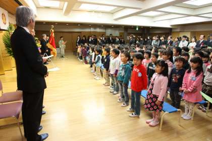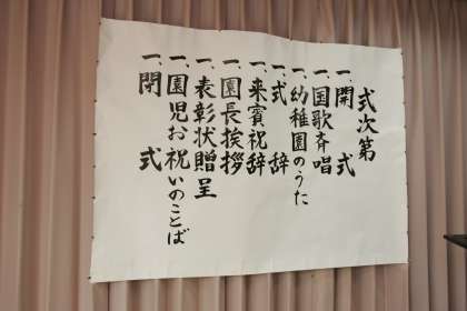 10時からの式では、子ども達もお祝いの言葉や歌を披露しました。読み聞かせボランテイアさんへの表彰状授与もありました。30分間三歳児もしっかり参加することができ、4月からの成長を嬉しく思いました。「子どもは地域の宝である」とのお話が、心に響きました。統合時のご苦労のことを思い幼稚園を限りなく支援してくださっている皆さんの有り難さを改めて痛感しました。中京もえぎ幼稚園を大切にしていかねばと園長としての責任を感じています。本当にありがとうございます。