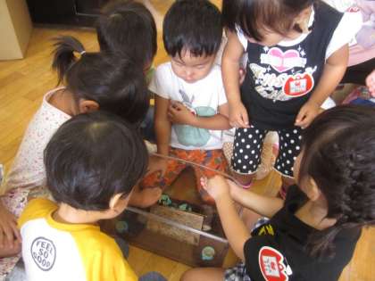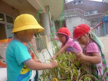 その他にも,アサガオの種ができているのに気づいて,「また植えたらお花咲くかなぁ」「大事に置いとこう」など言って大事に取って集めている姿が見られます。