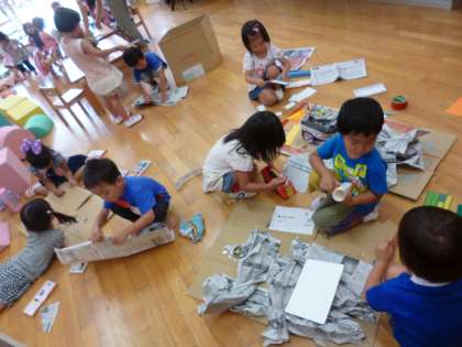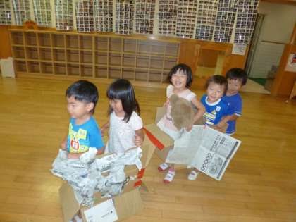 弁当後は子ども達は消防士さんに大変身!段ボールを用意すると,「消防車つくるよ!」「はしごとホースあったよ!」など言いながら,新聞紙や廃材をペタペタ貼って,それに乗って,園内をパトロール!「火事だ!火を消すぞ!3,2,1・・ぶしゃー!」「水が足りない!ホースが足りない!」と大興奮しながらごっこ遊びを楽しみました!子ども達にとって,とても印象的で,心に残った経験でした。見たこと,経験したことを同じようにやってみようとしたり,思いを寄せる姿を大事にしていきたいと思います。