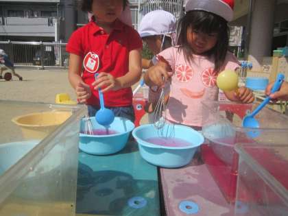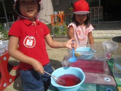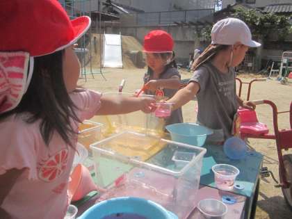今日も朝からいいお天気!子ども達は園庭で気持ちよく遊びました。園庭の花で色水遊びを楽しんでいます。オシロイバナを水につけて指先で潰してみると,水がだんだんと綺麗なピンク色に変わっていくことを発見しました。「これはリンゴジュース!」「こっちはブドウ味なんだよー!」色々な味のジュースに見立ててジュース屋さんになって遊びました。すると年中組のお兄ちゃん達がジュースを買いに来てくれたので,またまたオシロイバナを探しに行きました。