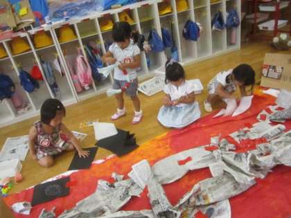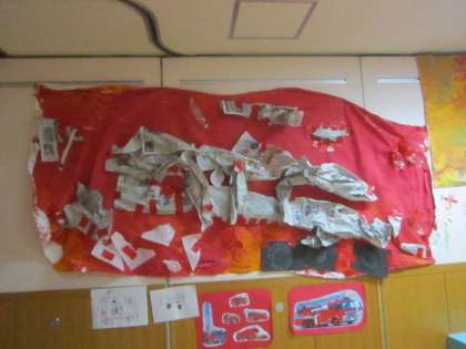 昨日消防車への思いを膨らませながらした絵の具遊び。せっかくできた大きな消防車。部屋に出して「ホースやはしご,たくさんついてたね」「運転するところがいるね」などと話をしながら新聞紙や廃材をランプや階段に見立てるなどして,大きな消防車ができました!「大きい!」「やったー!」「部屋に飾って!」「ママにも見せよう」とても嬉しかったようです。