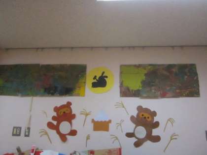 また,もうすぐお月見ということで,部屋の壁面の月にうさぎが・・・「あれ?うさぎがいる!」「昨日はなかった!」「おもちついてるね」子ども達も興味津々・・・「うさぎさんばいばい」・・・来週もうさぎさんはいるかな?うさぎに思いを寄せる生活を大事にしていきたいです。