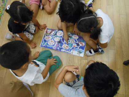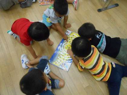 4歳児のひまわり組とたんぽぽ組は,迷路の絵本を購入しています。4月から,子どもたちはこの本が大好きで,頭を突き合わせて友達と一緒に指でなぞって楽しんでいます。