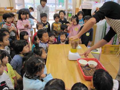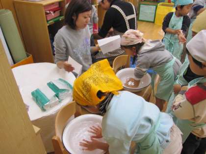 4歳児は御苑で拾ってきたどんぐりで調理をしました。どんぐり白玉団子です。前日までせっせとどんぐりの皮むきをしていた子どもたちは興味津々です。少しずつですがみんなで食べました。熱々をいただくと中からつぶしてない実が出てきます。素朴な味のおやつです。参観のお客様にも食べてもらって大成功でした。どんぐりが食べられることを発見してから今日までの過程で子ども達は様々な体験をすることができました。自然観察会のNさんに感謝です。ありがとうございました。