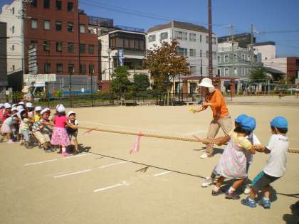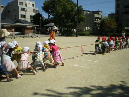 5歳児の子どもたちは,連日隣の竹間公園で赤・青・黄色の3チームに分かれて,リレーや綱引きに頑張っています。