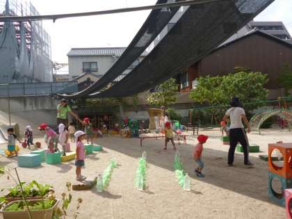昨日(10/7)見た探検のお話が心に残り,今日(10/8)も園庭で巧技台や積木などを出して,その上からジャンプしたり,迷路のように渡ったりして楽しんでいました。