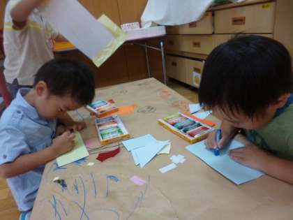 「地図がいるわ!」と言って,部屋に戻って,紙とクレヨンを取り出して地図を描く子どももいました。「ここは水たまり!」「ここは穴やし気をつけなあかんよ!」「ここにたからものがあるねん!」と言いいながら思い思いに地図をかいて,それを持ってまた園庭,園内を探検していました。
