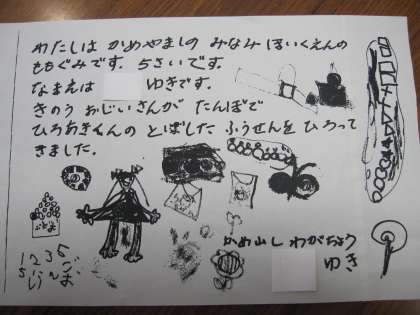 幼稚園の創立10周年記念に飛ばした風船を拾って下さった方からのお便りの紹介です。保育園に通う5歳のお孫さんからです。ありがとうございました。これで10の風船が拾われたことが判明しました。どうぞお心当たりの方はご連絡くださいませ。お待ちしています。