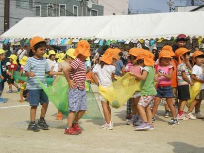 2つ目のプログラムも“玉”を使っての遊びでした。こちらは“玉入れ”だったのですが,1回戦は普通の玉入れでポールのかごを狙って投げ入れました。しかし,今回はどちらが多く入ったかという勝ち負けを大事にするのではなく,“狙って投げる”ということを大事にしたいと考えました。なかなか思うように玉はかごの中に入りません。それでもあきらめずに玉を放り投げている子どもたちがたくさんいました。この狙って投げるということも日頃の遊びのなかではなかなか経験できない遊びだと思います。何回も遊びながら,少しずつ力がついてきていると思います。