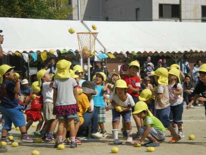 “玉”イコール“玉入れ”と大人は概念がありますが,子どもたちは“玉”一つでもいろいろな遊びを考えられるのです。頭や体に載せて歩くこと,足に挟んでジャンプすること,高くまで放り上げること,遠くまで投げること,的にあてること,輪の中をくぐらすこと,ごっこ遊びのごちそう・・・etc。