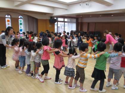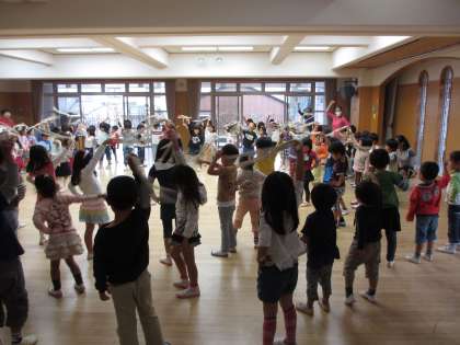 年長の子たちの姿はとてもかっこよくて,さっきまで保育室で勇ましい掛け声を楽しんでいた年中の子たちは,年長の踊る様子を見て,ただただ黙って座って見ていました。年長の先生が「一緒にやろう!」と言ってくれてから踊り始めると,とても嬉しそうな顔をして踊っていました。