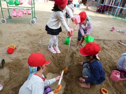 今日はとってもいい天気!3歳は今日も元気いっぱいに戸外で遊ぶ姿が多く見られました。