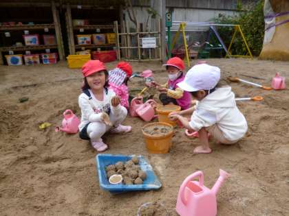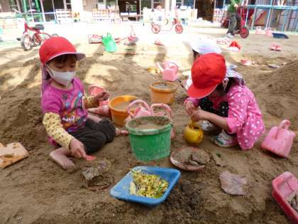 裸足になって砂場で遊んでいると,落ち葉がたくさん落ちているのに気づき,「葉っぱがたくさん!」と嬉しそう!それらを集めて,砂場のごちそうに混ぜて遊ぶことにしました!葉っぱのジュースや葉っぱ入り団子をつくって喜んでいました。