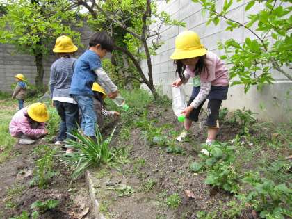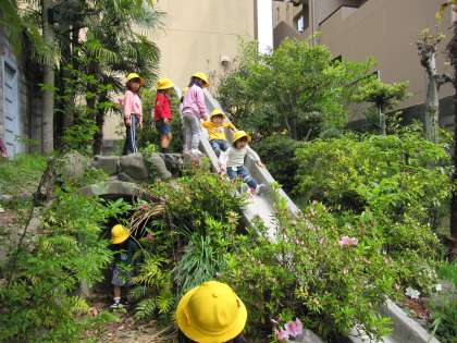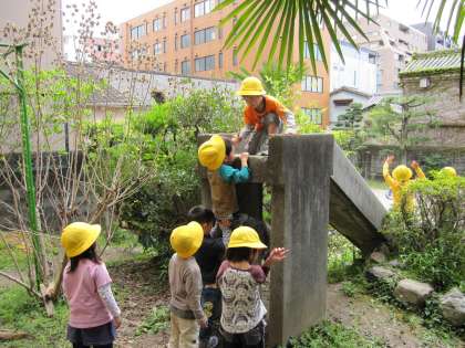 年長児が歩いて20分ほどの元明倫幼稚園へ出かけました。猫の額ほどの畑に芋を栽培しています。毎回行って世話をするのが目的なのですが、子どもたちは元の園庭で遊ぶことを楽しみにしています。梯子のない石の滑り台とトンネルがあって、子どもたちの冒険心をかきたてます。子どもたちの間では古い昔のイメージからドラゴンが住んでいると言い伝えられているようです。牙?足跡?光る石?いろいろな発見で大騒ぎです。今日は滑り台に大勢がチャレンジして、かすり傷をつくっていました。ビル街のオアシスのような旧幼稚園にはこどもたちの夢がいっぱい詰まっています。「ほしファーム」大好きな子どもたちです。私は久しぶりの園外保育で日焼けし気持ちのよい汗をかきました。また一緒に行こうね。