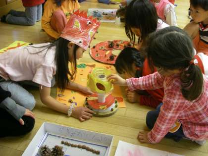 御所南小学校の1年生60人が、どんぐりや落ち葉などの自然物を使って作った、ゲームや飾りのお店屋さんをしにきてくれました。