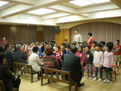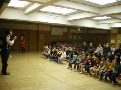 何か光るものを身につけておくとよくわかるということで,お越しいただいていたおじいちゃん・おばあちゃんには,反射材のプレートのお土産をいただきました。「夜,出歩く時には腕などに巻きつけてから歩いてね」と警察の方からのお話を受けて,こどもたちからプレゼントしました。早速に手に巻きつけてくださっていました。最後にみんなから「交通事故に気をつけてね」というメッセージを伝えさせていただきました。おじいちゃん・おばあちゃん方は「は〜い」と手を大きく上げて返事をしてくださいました。