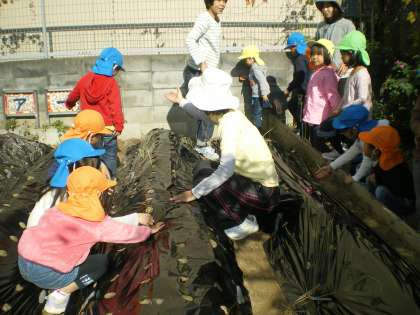 先生やパパママティーチャーのお母さん先生たちが,畑の畝をつくっている間に,一緒に遊んで待っていました。畑の用意ができると,4,5歳児で2〜3人組となり,玉ねぎの苗を植えました。玉ねぎの苗は細くて,穴をあけた中に入れるのですが,何となく不安定で倒れそうになります。でも3人で協力して,苗を植えることができました。