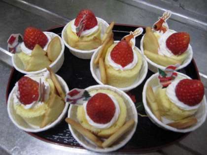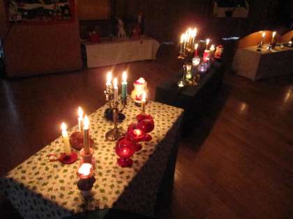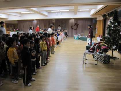 新型インフルエンザの感染拡大を心配しながら「楽しい集い」をしました。当初は全学年一緒に集うことを計画していたのですが、大勢で集まる時間を短くしました。メインは子ども達一人ひとりがサンタさんからプレゼントをもらう場面です。電話のベルでサンタさんが到着したことを報せ、一組ずつ遊戯室に行ってサンタさんと過ごしました。ロウソクの灯りの中でどの子も真剣でした。もらったプレゼントは触ると冷たくて北極の香りがしました。お礼に歌を歌うとサンタさんが拍手をしてくださいました。その後パーティでは可愛いケーキを食べました。子ども達の笑顔いっぱいの一日になりました。サンタさん、幼稚園へきてくださってありがとうございました。